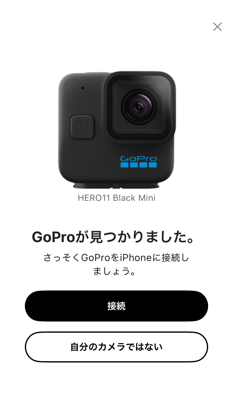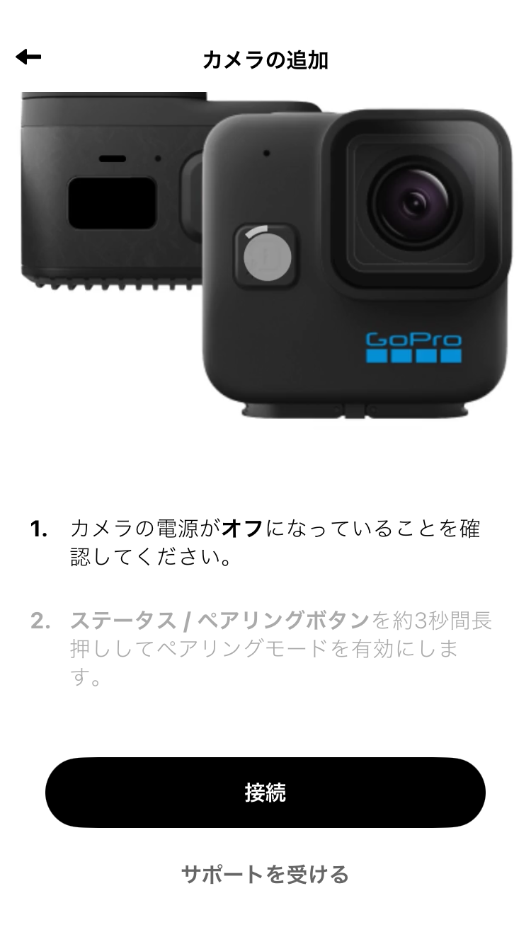 カメラの電源がオフかつペアリングモードになっていることを確認し、「接続」を押します。