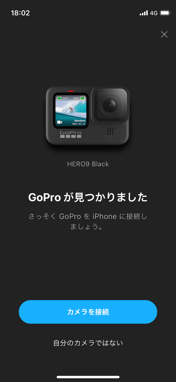 次の画面で「GoProが見つかりました」と表示されます。「カメラを接続」をタップします。