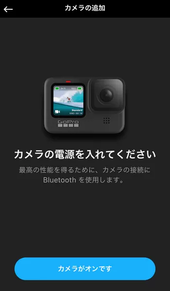「カメラの電源を入れてください」と表示されます。既に電源が入っている場合は、「カメラがオンです」をタップします。