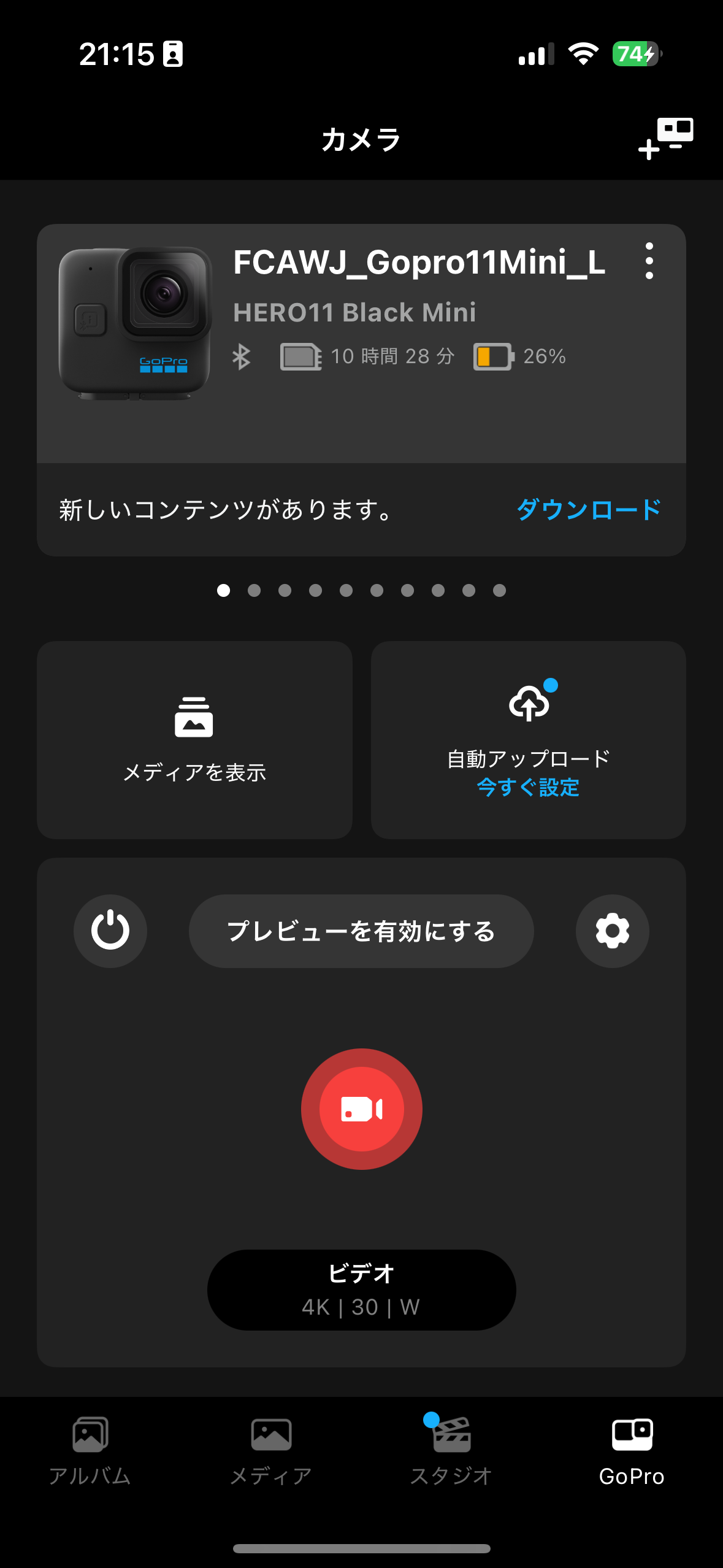 スマホから再び「Gopro Quick」を開きます。画面中央部の「プレビューを有効にする」を押し、プレビュー画面に遷移します。Wi-Fi接続後、10-15秒程待つとプレビュー映像が確認できます。