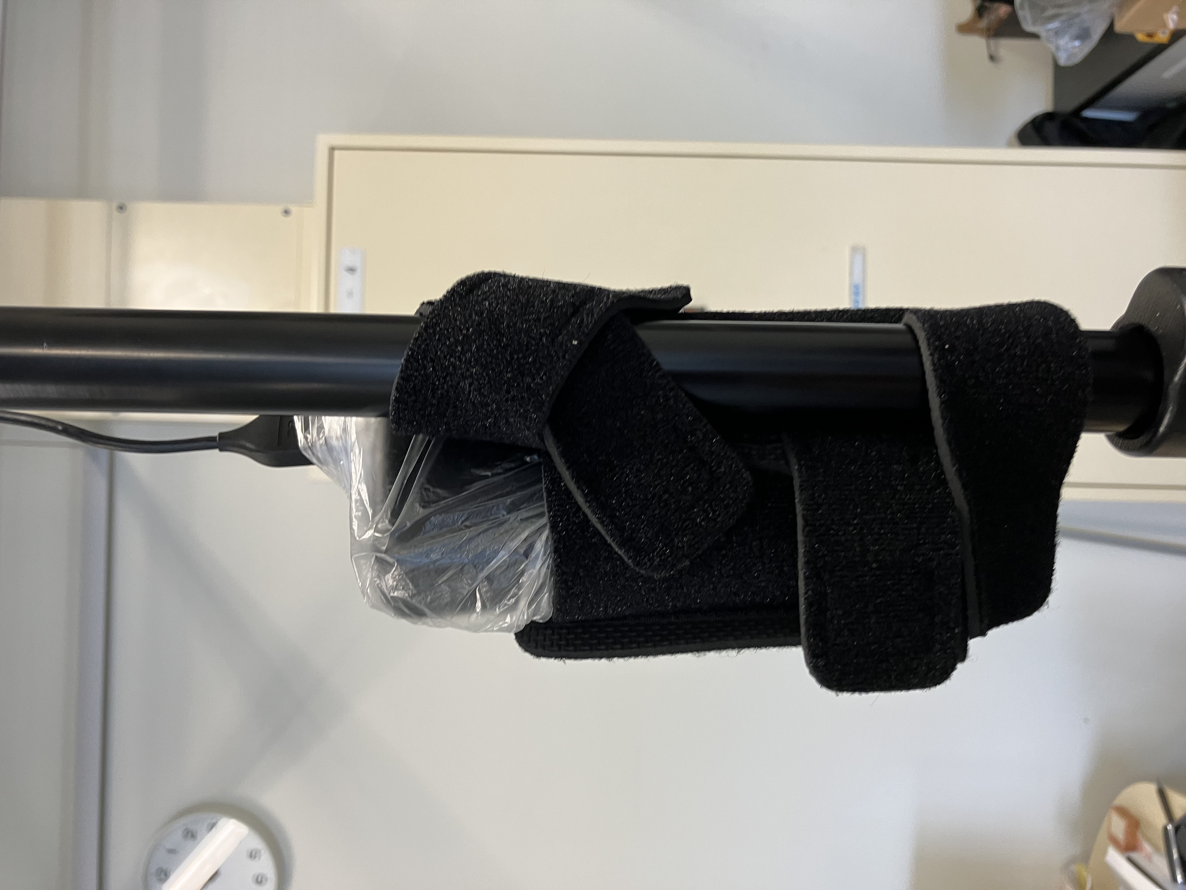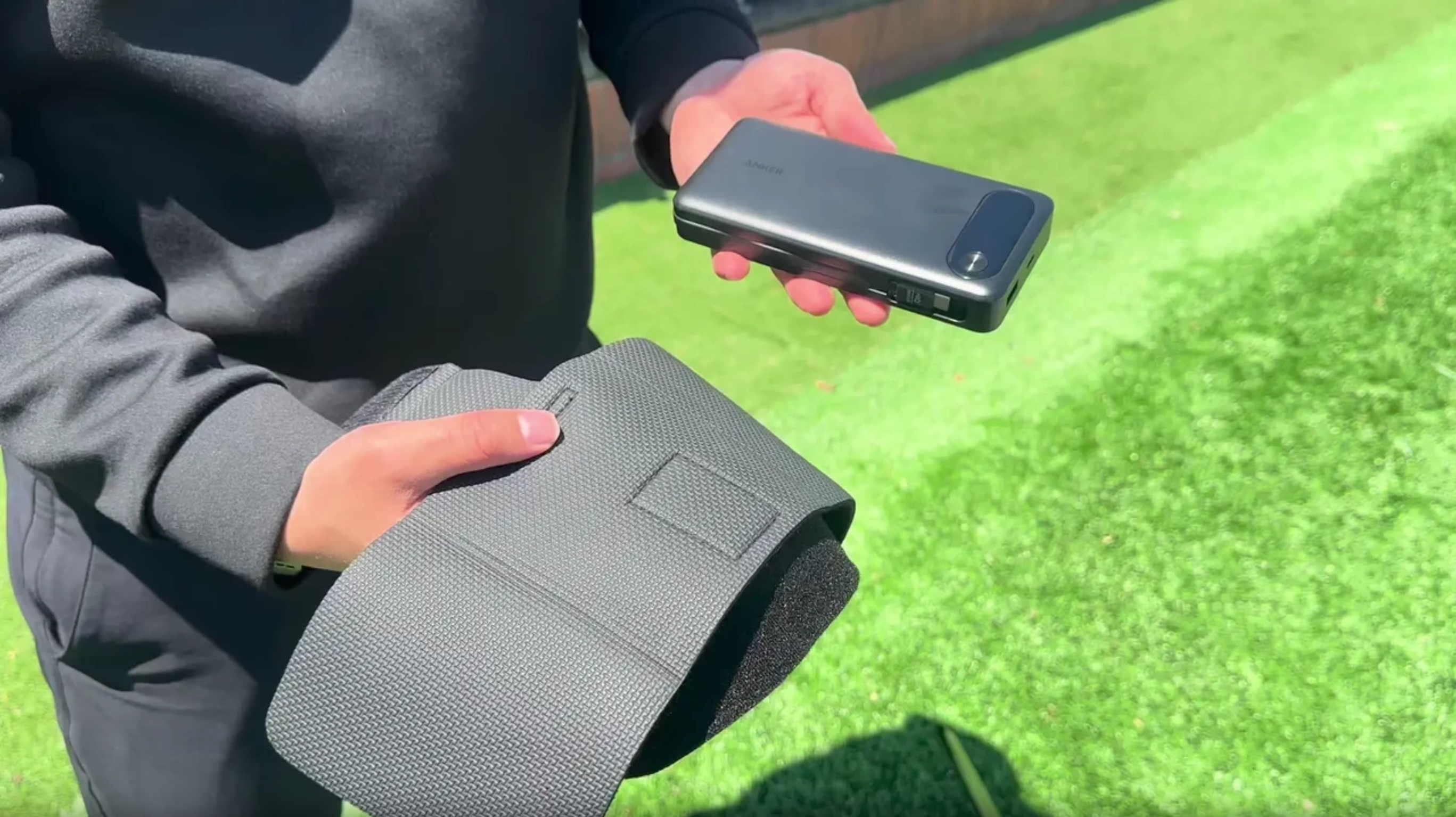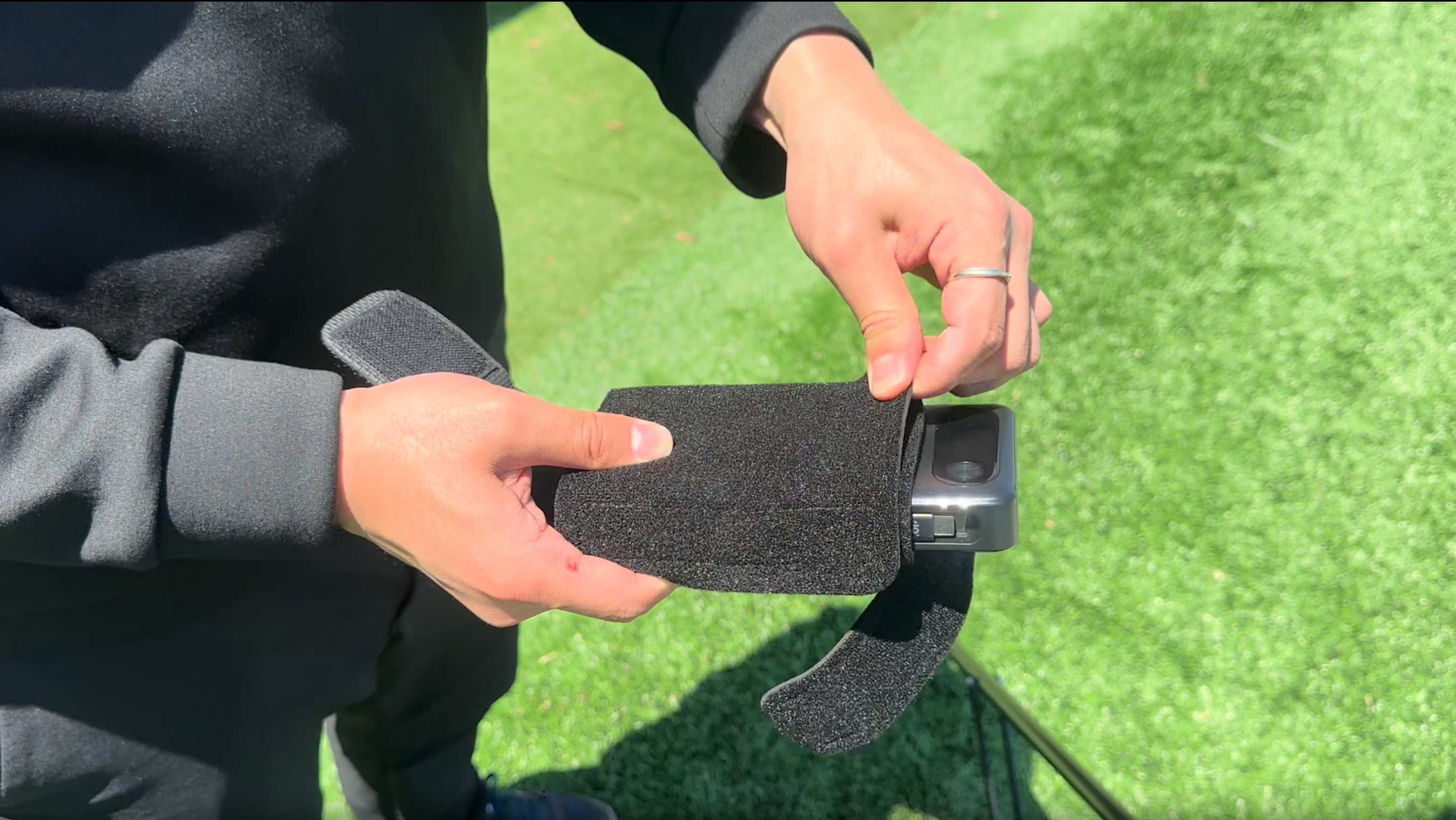 モバイルバッテリーをGoProの充電コードと接続します。コードが外れないよう、バッテリーをカバーに入れ、カメラ真下位置にマジックテープできつく固定します。