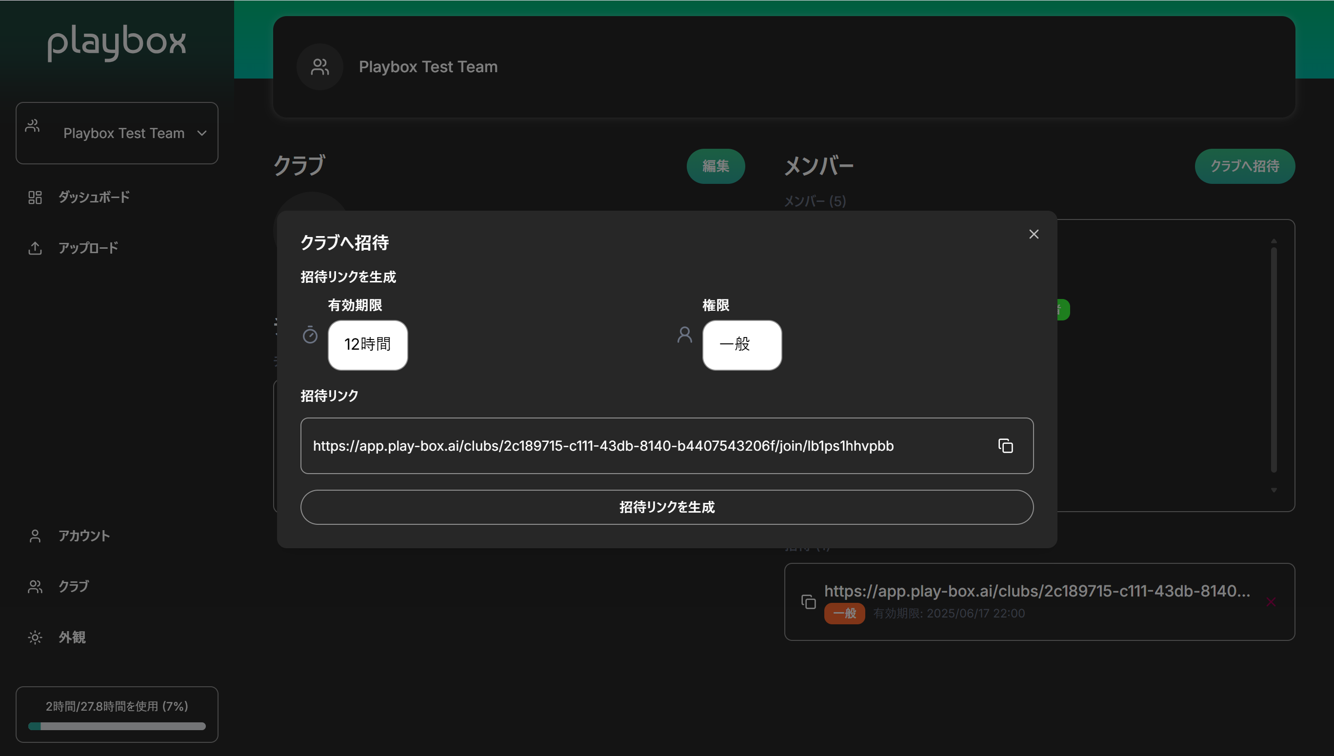 役割を選択後、「招待リンクを生成」を押し招待リンクを発行します。