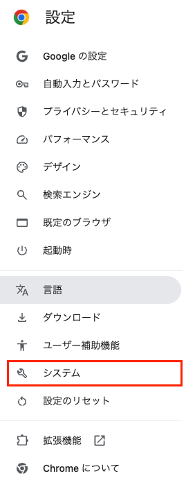 Chrome 右上の「︙」メニューから「設定」→「システム」を開く