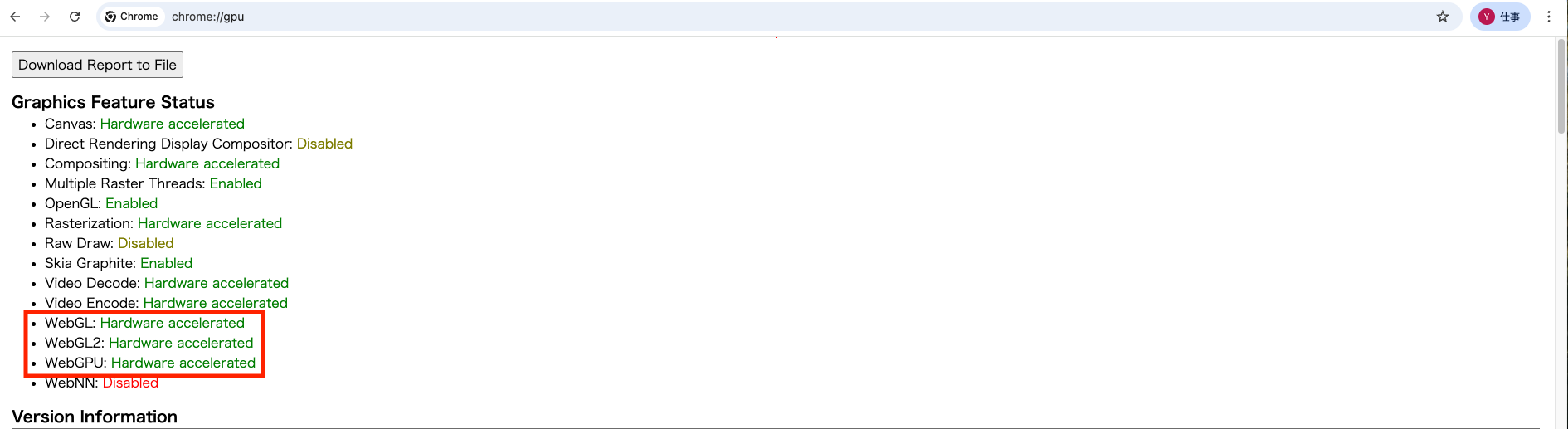 Chrome を再起動しchrome://gpuにアクセスして 、「WebGL」「WebGL2」「WebGPU」の3項目で、"Hardware accelerated" と表示されていることを確認